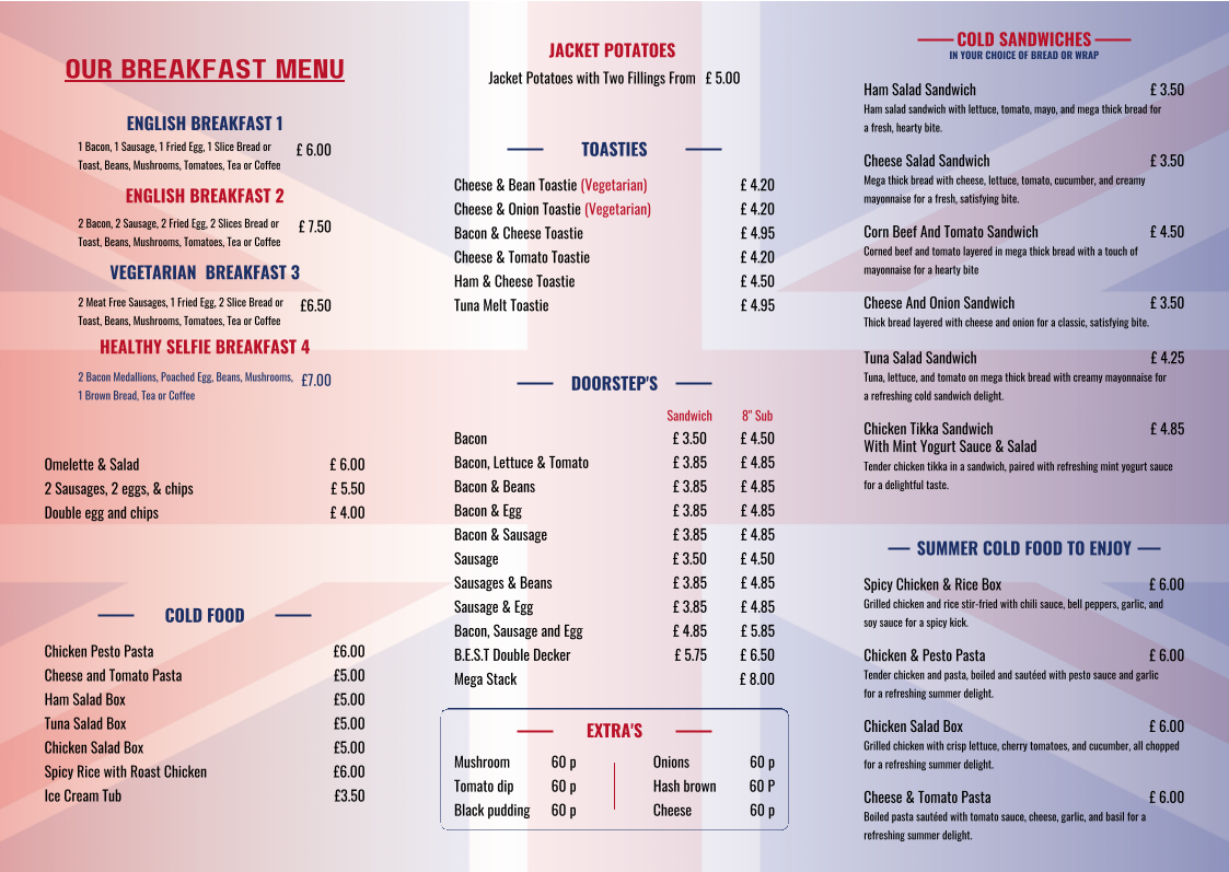 Kush's Cafe serves up a delightful array of dishes, creating an inviting atmosphere that's perfect for unwinding with family and friends. The crowning glory of their menu is the All Day English Breakfast, which offers a lavish family fry-up complete with six sizzling bacon strips, six juicy sausages, fresh tomatoes, mushrooms, baked beans, toast, and crispy hash browns for just £34.99. It’s truly a feast for the senses, delivering that smoky, savory scent that will have you gulping down every delicious bite!